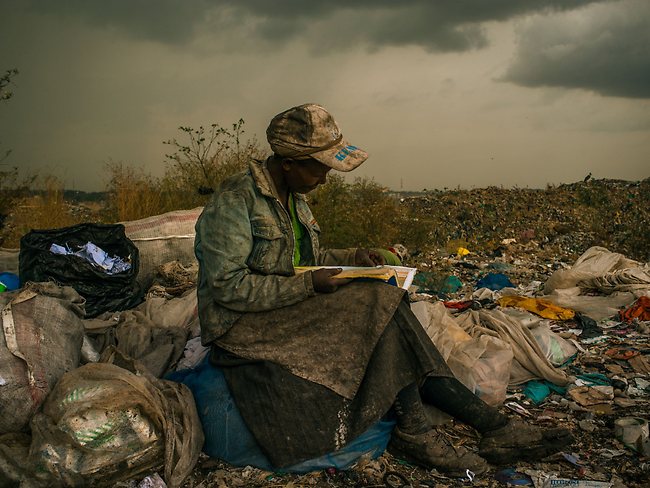 a woman who works as a trash picker at the 30-acre dump, which literally spills into households of one million people living in nearby slums, reading a book she came across on April 3, 2012 in Nairobi.