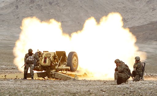 Afghan National Army soldiers fire artillery during a military training in Laghman province