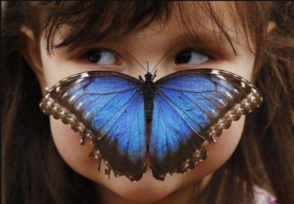 Stella Ferruzola, 3, poses with a Blue Morpho butterfly on her nose at the “Sensational Butterflies” exhibit, which runs through Sept. 15.