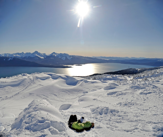 A skier reads behind a small snow hill out of the wind on top of Pittman Ridge at Eaglecrest Ski Resort in Juneau, Alaska, on March 4. In the background are Stephens Passage and Admiralty Island.